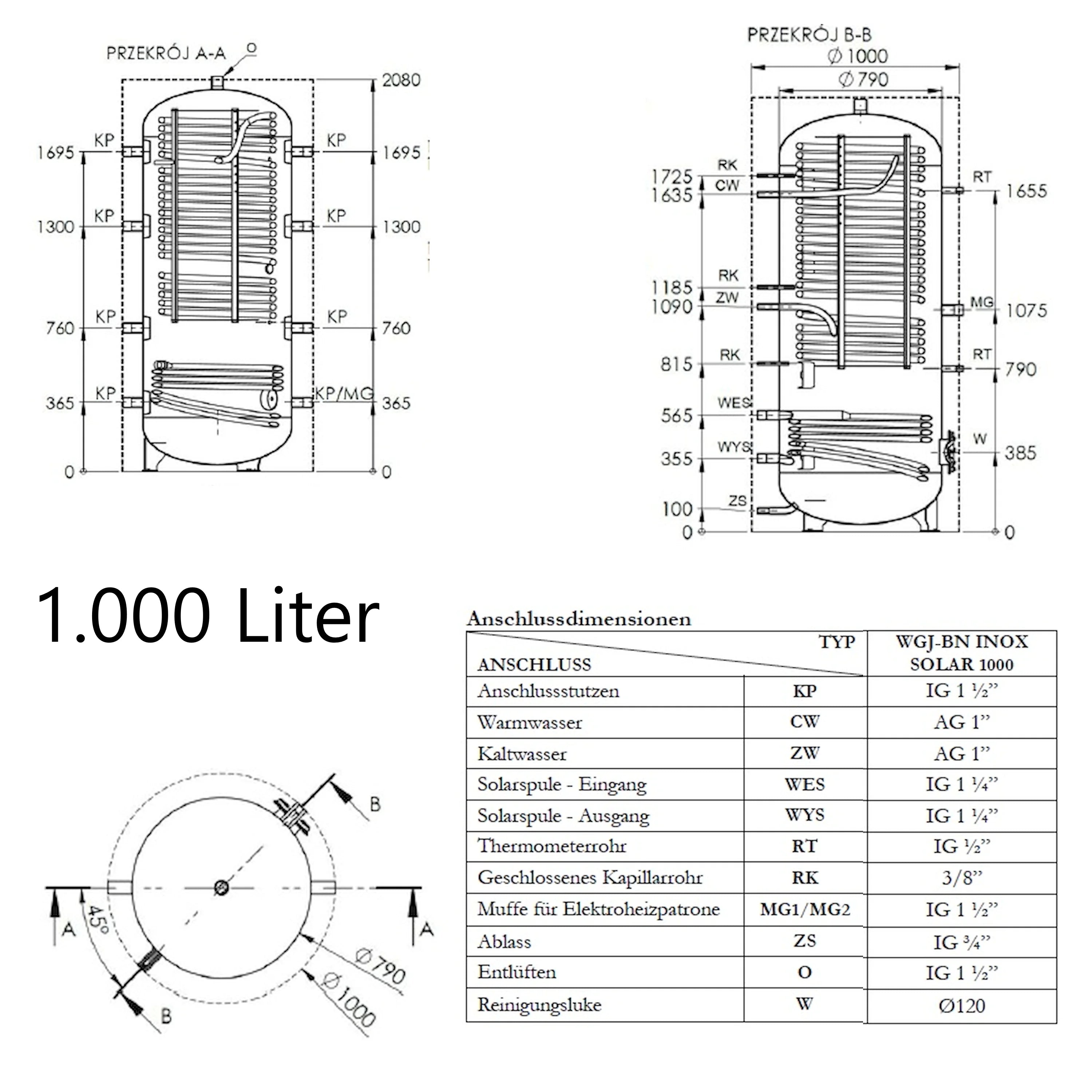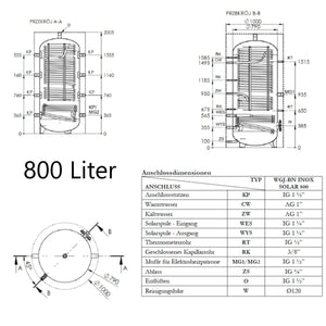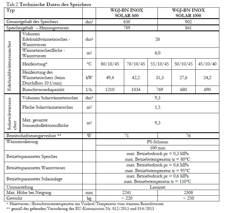 WGJ-BN INOX SOLAR е комбиниран буферен резервоар за затопляне на вода и битова гореща вода с вградена нагревателна серпентина от неръждаема стомана като топлообменник. Той е проектиран за интеграция в централни отоплителни системи с котли, термопомпи или за използване на слънчева топлина и позволява както съхранение на топлинна енергия, така и непрекъснато загряване на питейна вода.