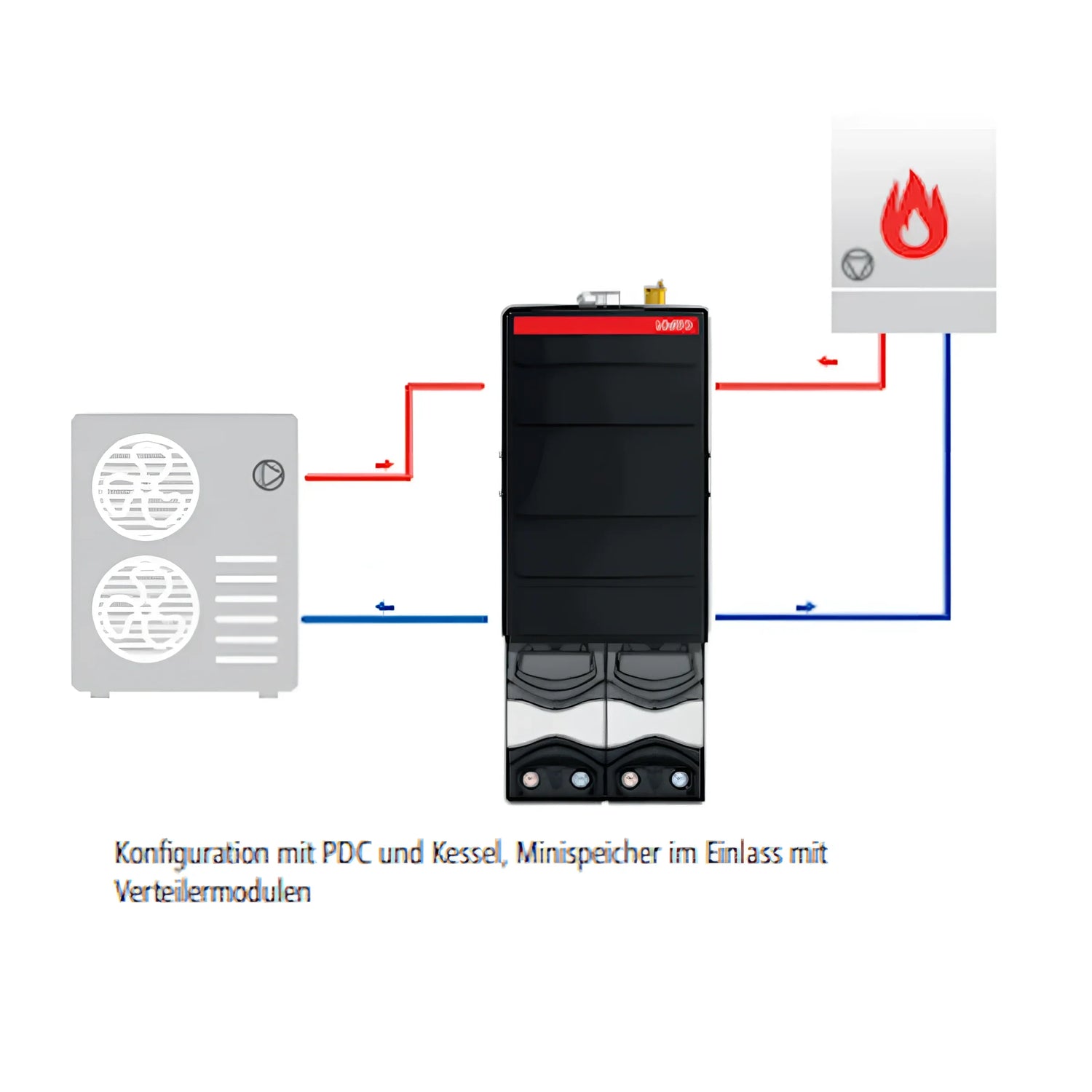 Whether as a buffer tank in heating systems, as a hydraulic separator, or as a distributor for up to two circuits – the Lovato Bomber 50 C covers a wide range of application scenarios. Its ultra-flat design saves valuable space, while the sophisticated interior architecture ensures even layering and high efficiency.