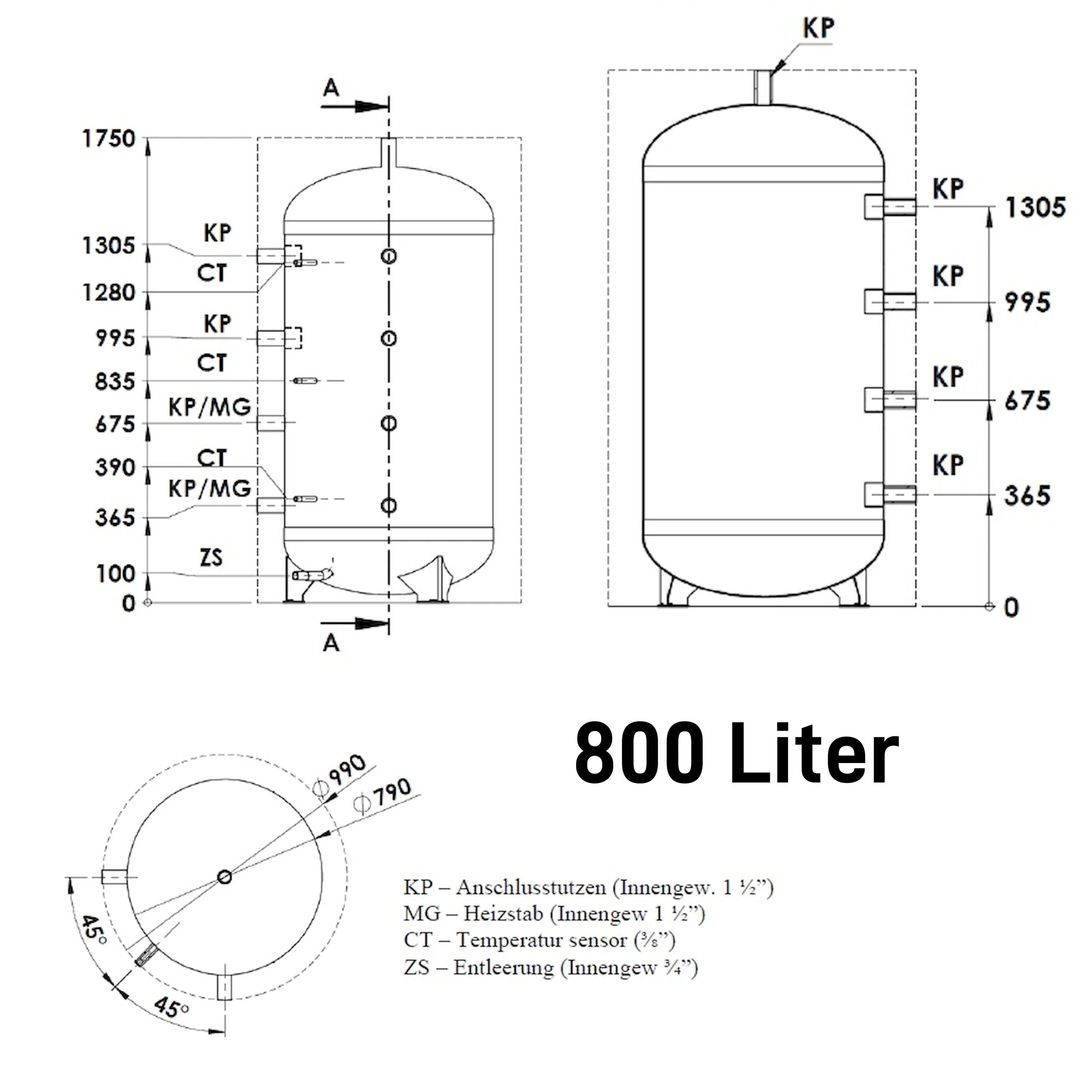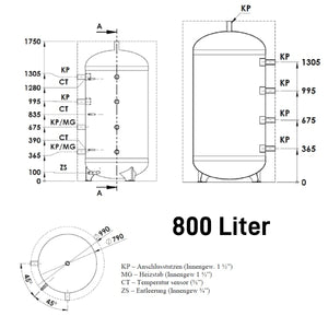 Connection dimensions: Connection piece (KP) internal thread 1½", heating element connection (MG) internal thread 1½", temperature sensor connection (CT) 3/8", Drain (ZS) internal thread 3/4".