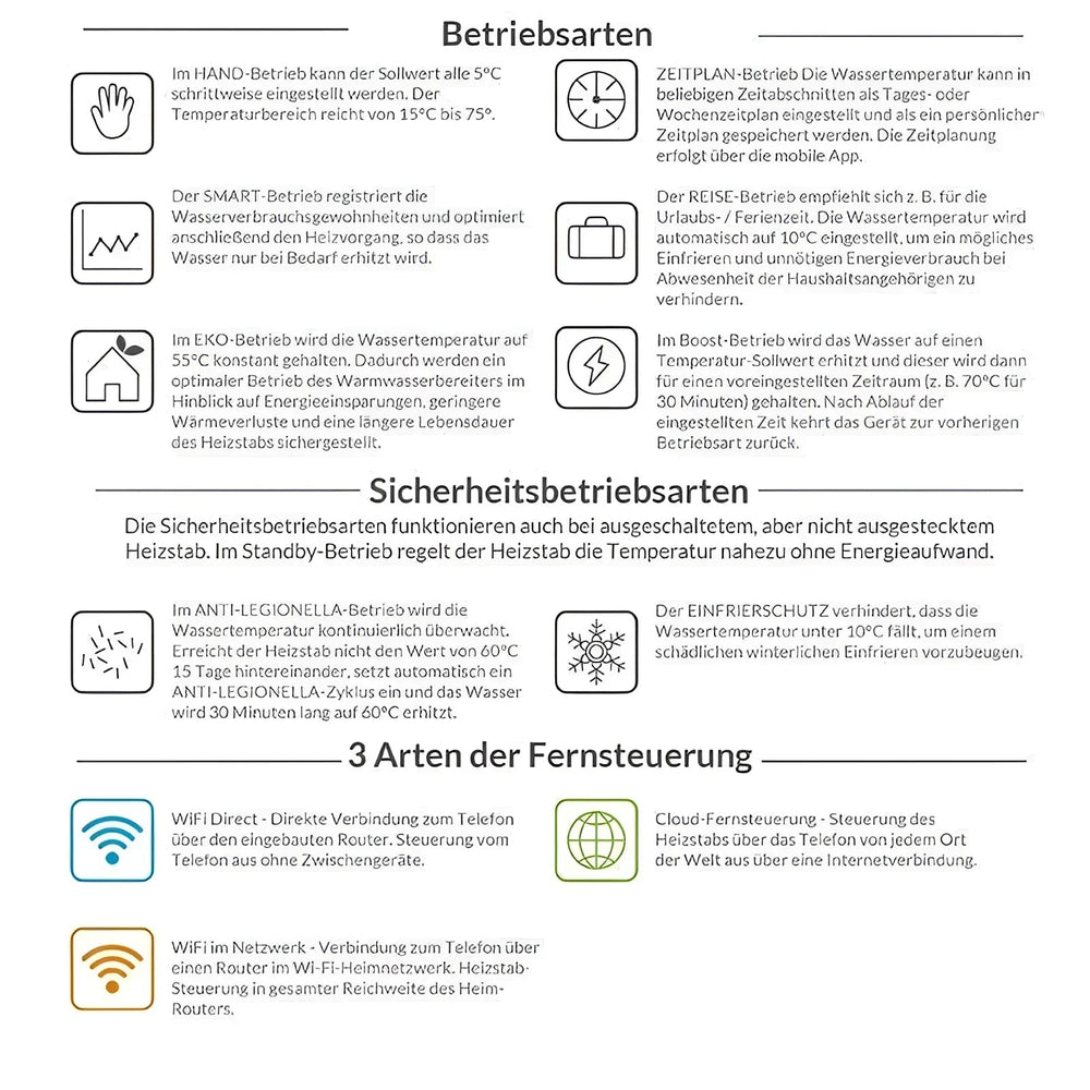 Sulle on saadaval kolme tüüpi kaugjuhtimispulti: WiFi Direct võimaldab otseühendust telefoni ja kütteelemendi vahel, samas kui WiFi võrgus tagab juhtimise koduse ruuteri kaudu. Pilve kaugjuhtimispuldi abil saate seadet juhtida ka kõikjal maailmas.