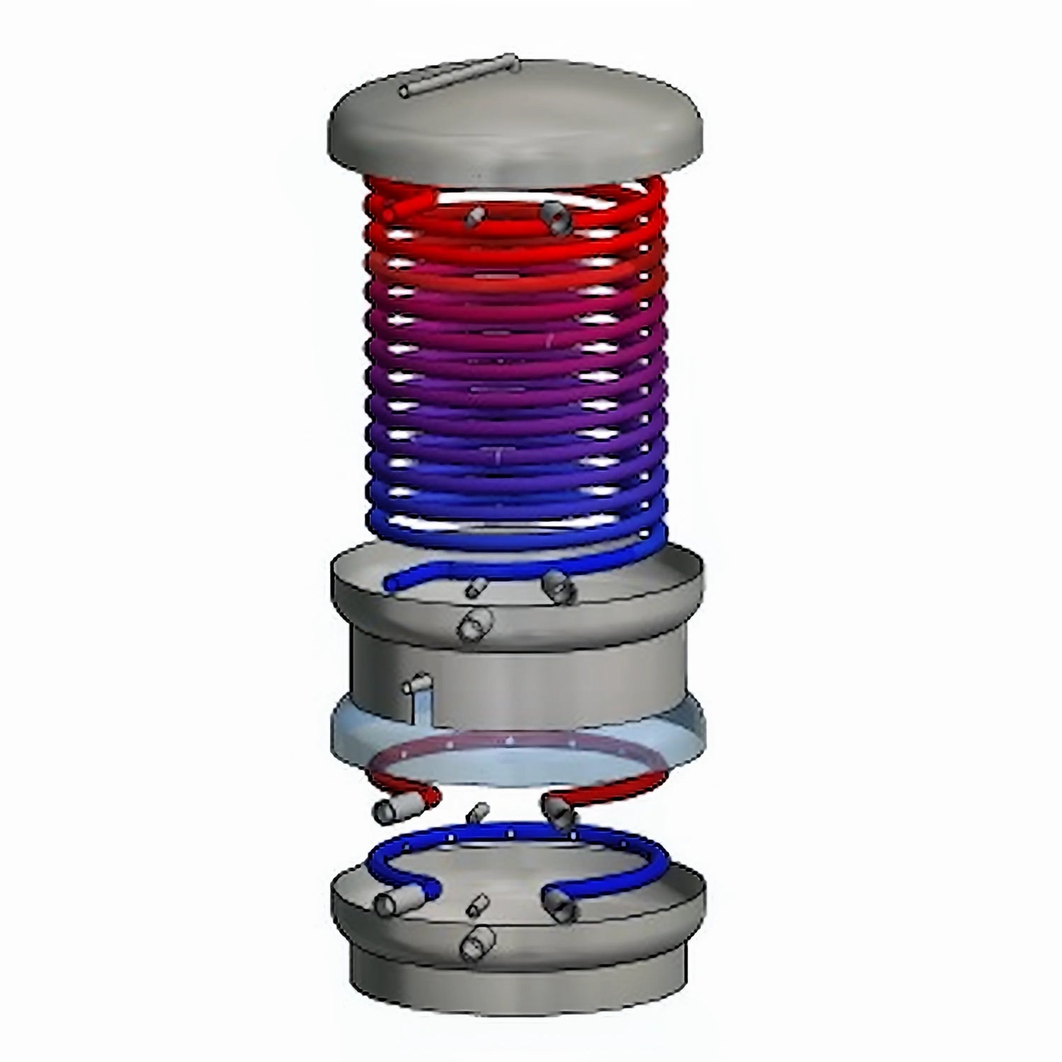 Zalogovnik je izdelan iz jekla kakovosti S235JRG2 v skladu z DIN 4753 in evropskim standardom EN 12897; toplotni izmenjevalec za pitno vodo je valovita cev iz nerjavečega jekla (1.4404), izdelana v Nemčiji. Zalogovnik je znotraj surov, zunaj premazan in razdeljen na dva toplotno ločena dela: zgoraj grelec za sladko vodo in spodaj grelni vmesni rezervoar.